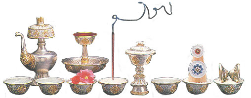 It is also possible to replace the water by rice in some of the bowls, to offer some flowers, put fruits, incense, a music instrument (small cymbals, drum,